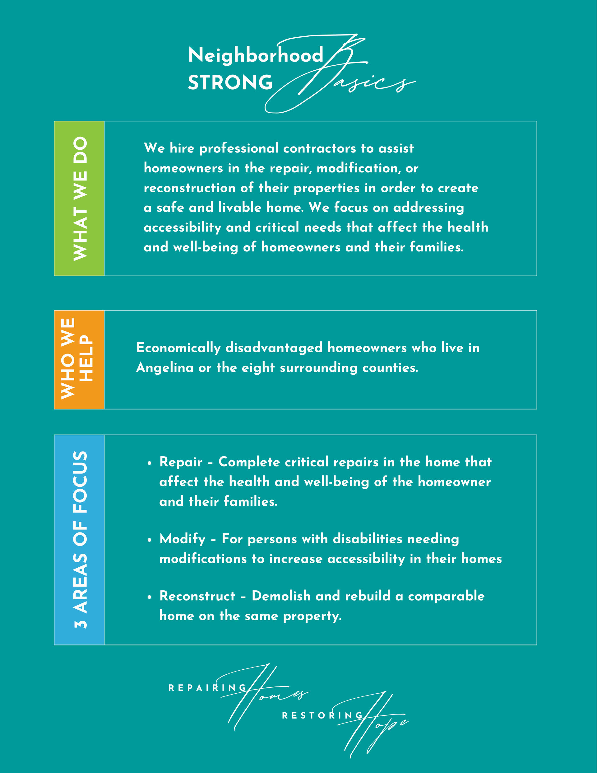It quickly became apparent that home repairs for economically disadvantaged families were an unmet need in the area. As a result, a 501(c)(3) was formed in October 2016, and Neighborhood Strong (Striving to Rebuild Our Neighborhood Great) was officially created.
